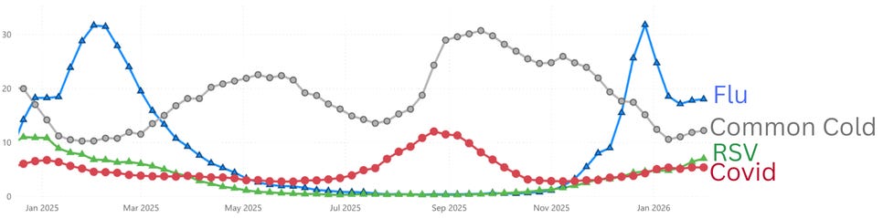 Influenza-like illness is annoyingly sticking around. This is mainly due to one strain of flu (called flu B), as well as rising rates of the common cold and RSV. RSV is now the highest it’s been all season, in an uncharacteristically late winter season effect.