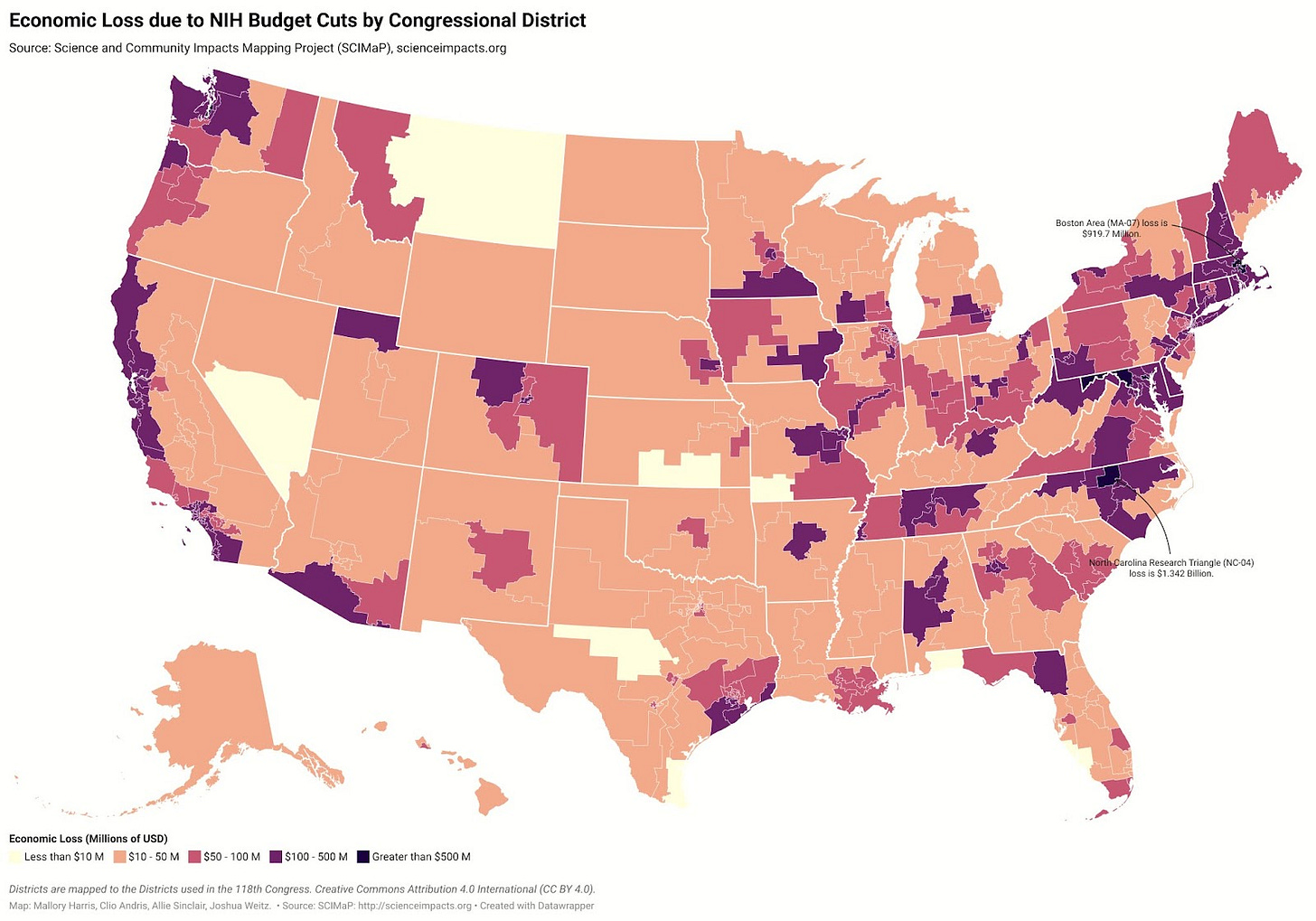 This also impacts local economies. If the NIH budget proposal moves forward, 200,000 jobs will be lost, resulting in $46 billion in economic losses. For each $1 invested in NIH, it returns $2.56 in local economies. For example, the University of Alabama, which receives significant support through the NIH, is the largest employer in the state.