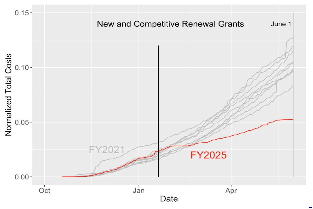 Research funding budgets rise and fall every fiscal year, depending on Congress's priorities, but this year is dramatically different. At the NIH alone, approximately 5,500 fewer research projects are being funded due to executive decisions, which is significantly lower than in any other year, as shown below.
