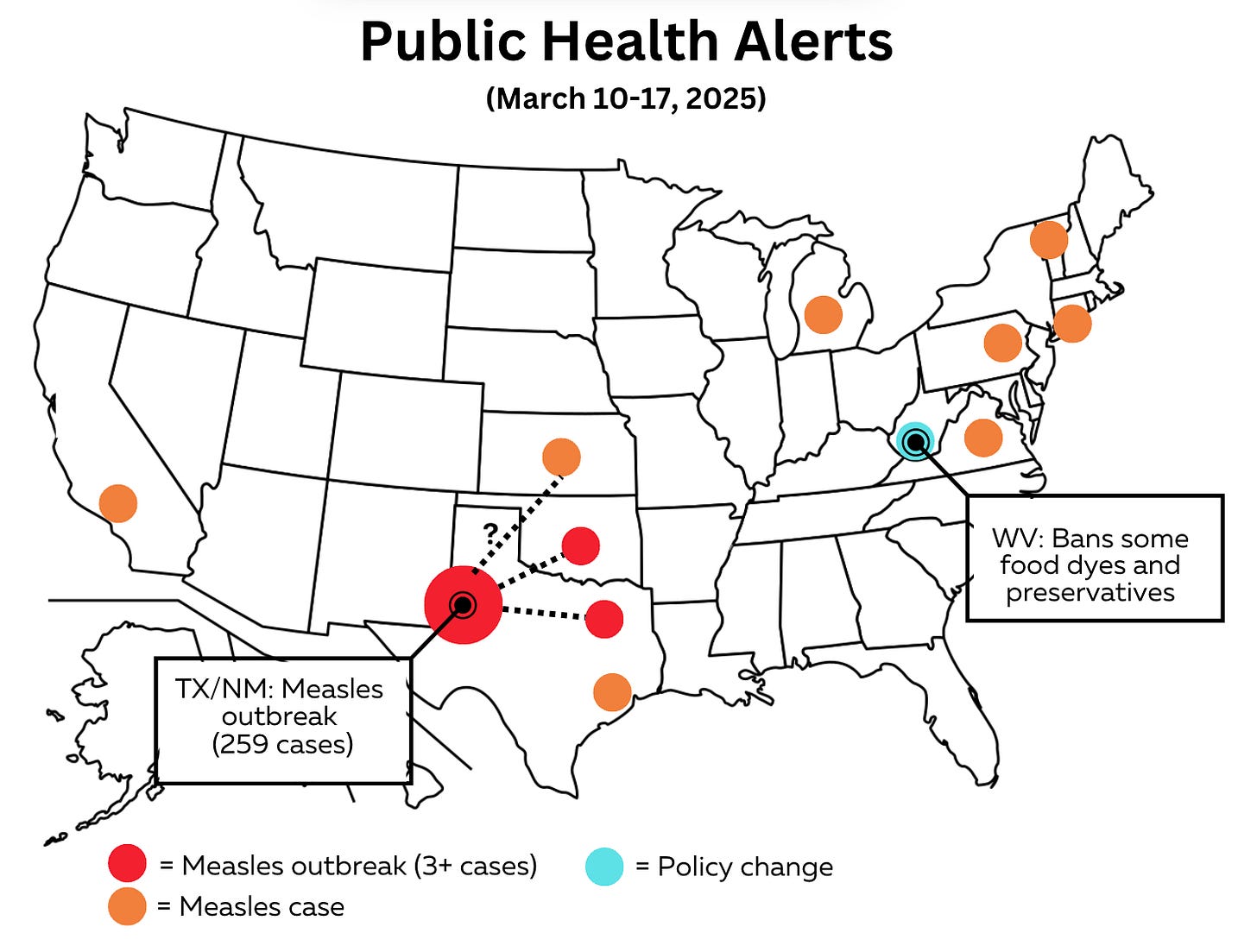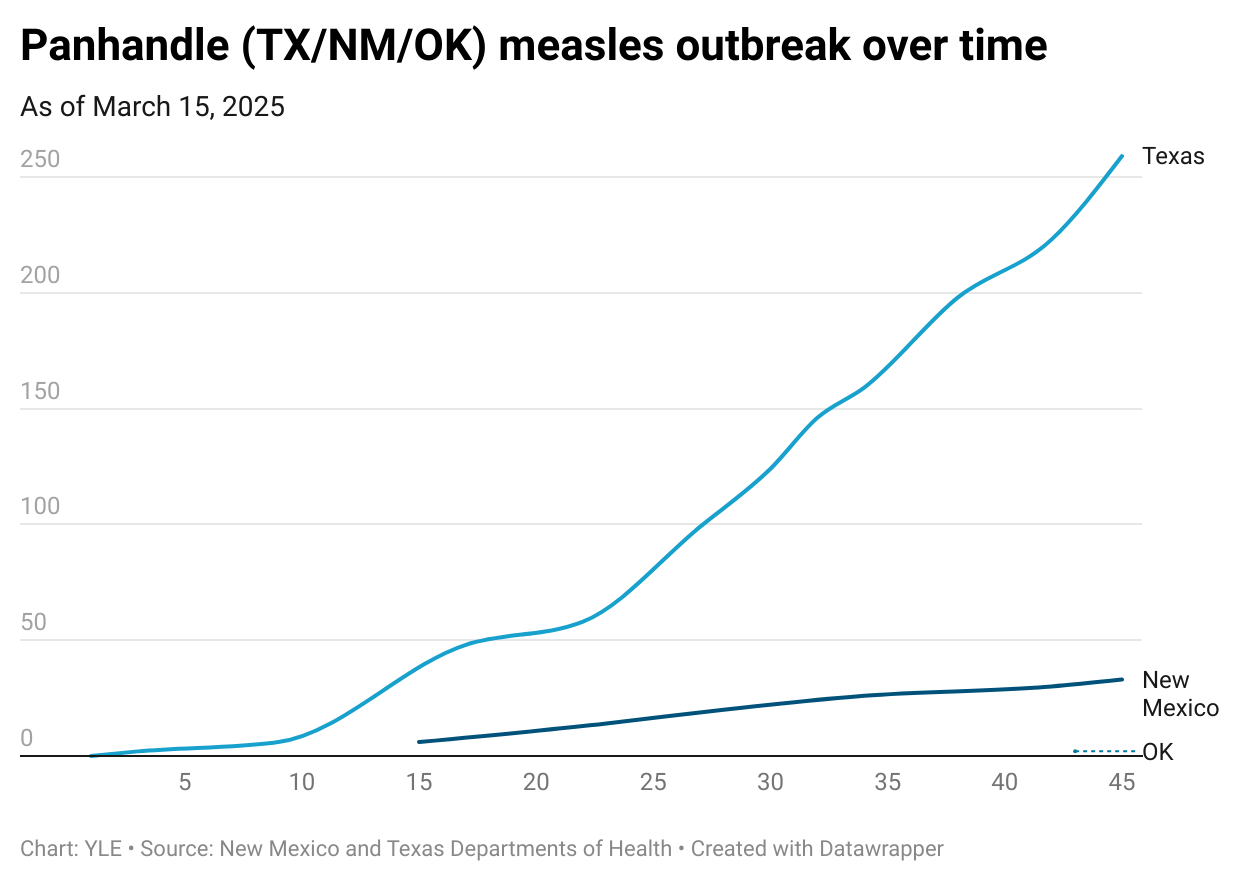 In the Texas/New Mexico outbreak, measles cases continue to climb—and estimates suggest the true count could be 4 times higher than reported. The outbreak is spreading beyond the Panhandle to East Texas, Oklahoma, Mexico, and possibly Kansas. The vast majority of cases are in unvaccinated, school-aged children.