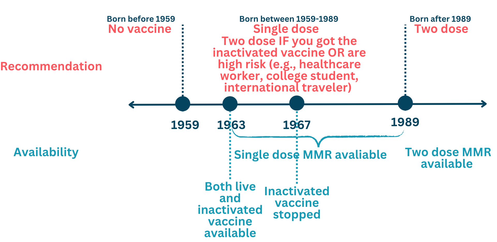 Between 1959 and 1963: No MMR vaccine was available. But you still need to be vaccinated.