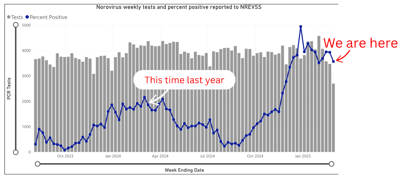 Norovirus—think diarrhea and vomiting—is having. a. year. Test positivity rates remain nearly double last year’s. The virus mutates slightly every few years, triggering a surge—and we’re in one now. Fortunately, norovirus season is typically November–April, so I’m hopeful this will be winding down soon.