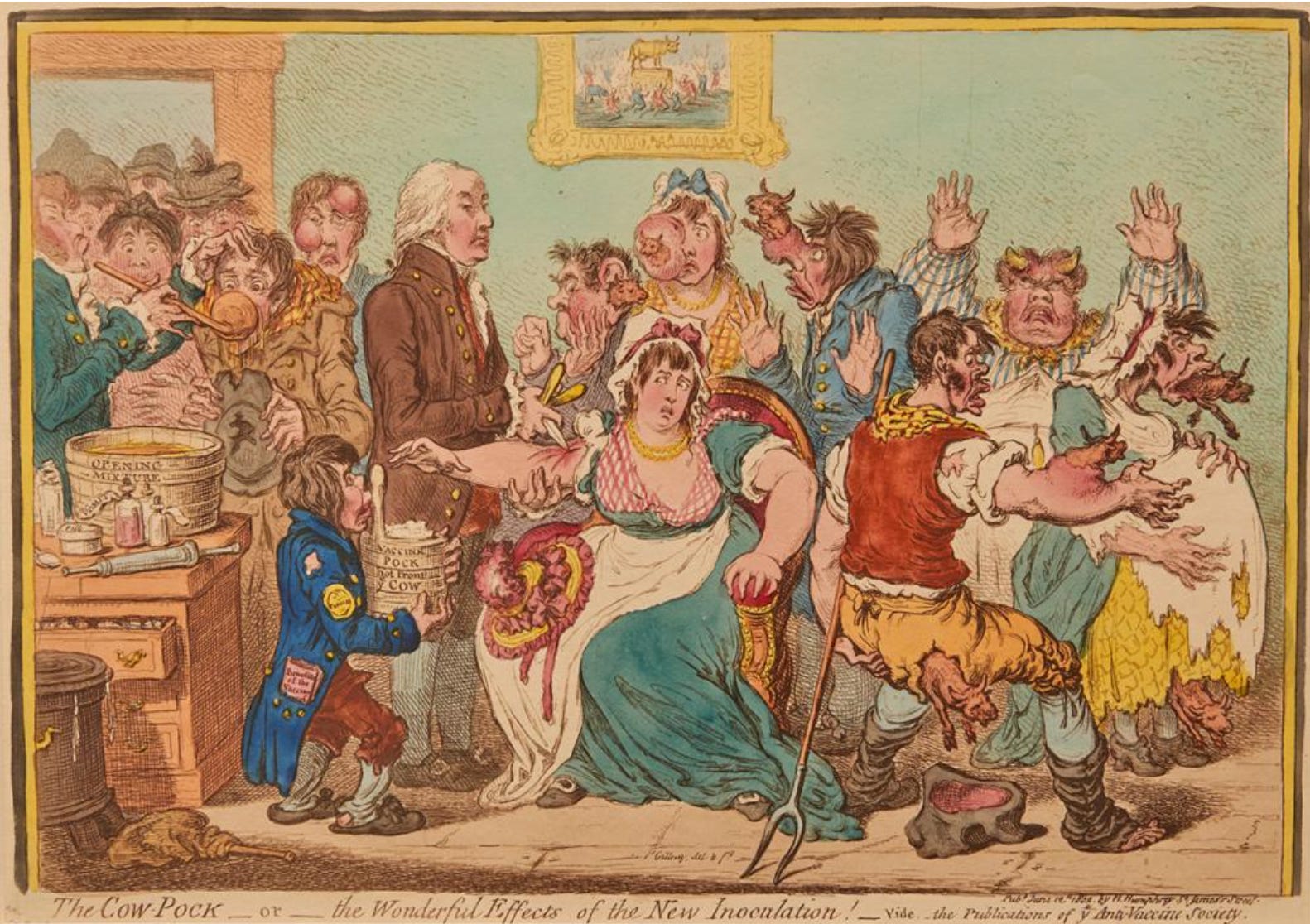 Navigating it isn’t necessarily new—public skepticism of vaccines and institutions, for example, has been around for centuries. Below is a cartoon from 1802 showing people sprouting cow parts after getting the smallpox vaccine (because the vaccine was made from cowpox serum).