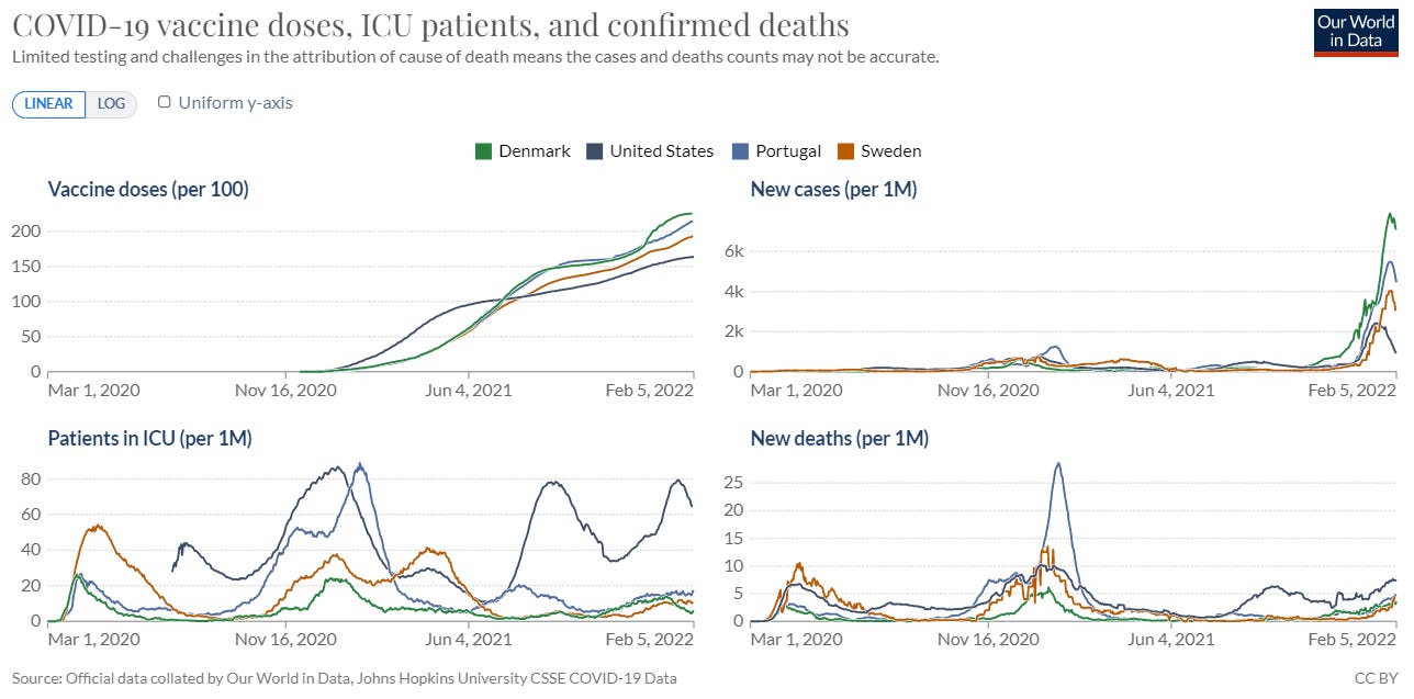 Vaccination rate of 85% of total population. I deliberately included a vaccination cut-off point at 85% to indicate removing precautions regardless of case rates. Several countries, like Denmark and Sweden, are lifting all restrictions. And, I support this because their vaccination rates are high. During the Omicron wave, it was blaringly obvious that this high vaccination rate reduced burden on their healthcare systems. Below are four graphs with key COVID19 metrics across Denmark, Sweden, Portugal, and the U.S. The U.S. has, by far, the lowest rate of vaccine doses per person. The U.S. also had overwhelmed hospitals with record breaking ICU numbers and deaths (this metric is still increasing, so this may eventually break records, too). This did not happen in the other countries.
