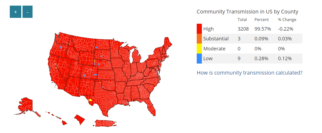 In addition, leveraging cases/TPR surveillance improves feasibility, because the CDC provides this metric for every county in the U.S. here. (For the record, 99% of counties are still in the red right now.)