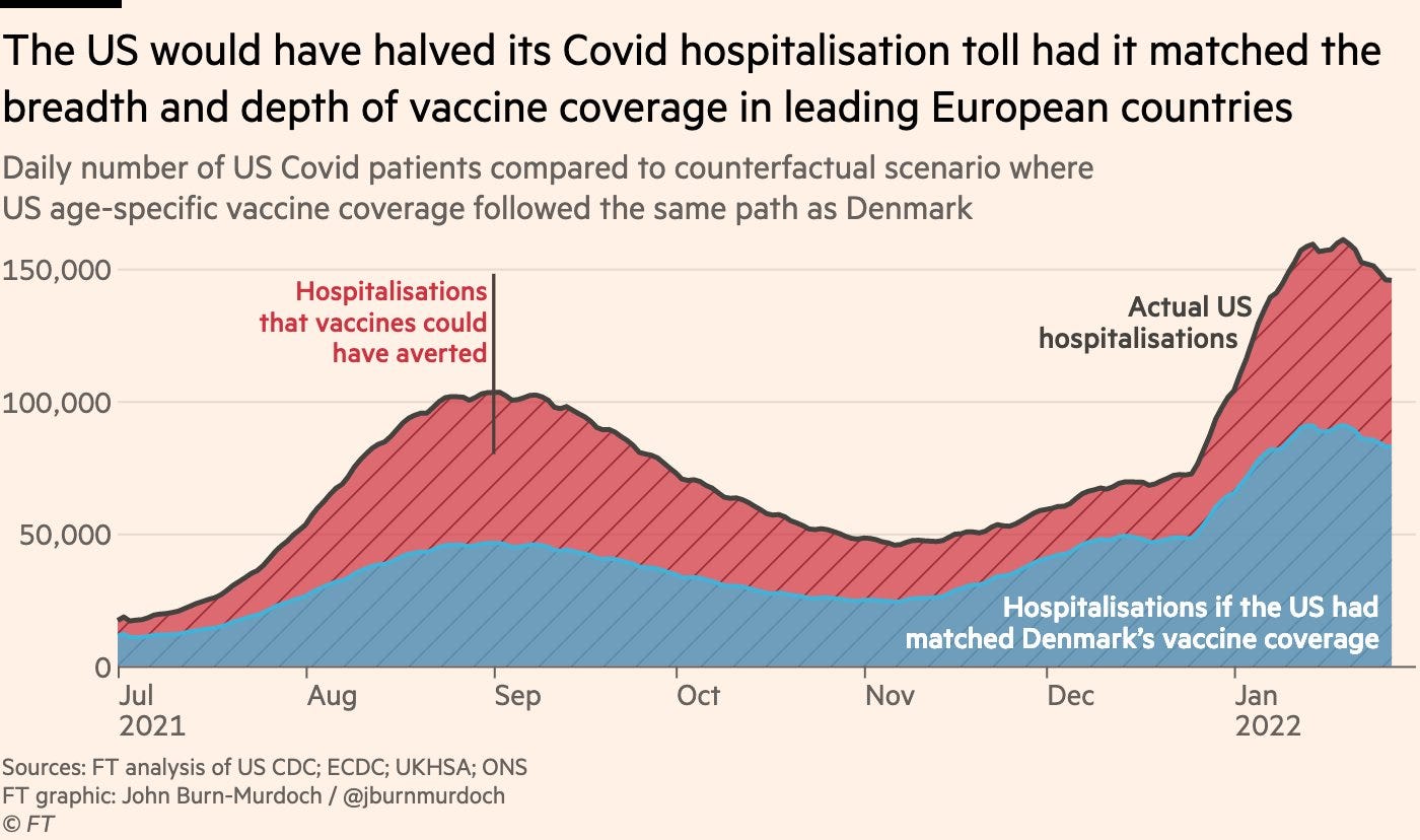 As John Burn-Murdoch from the Financial Times pointed out, if the U.S. had the same breadth and depth of vaccination as Denmark, hospitalizations would have halved during this recent wave.