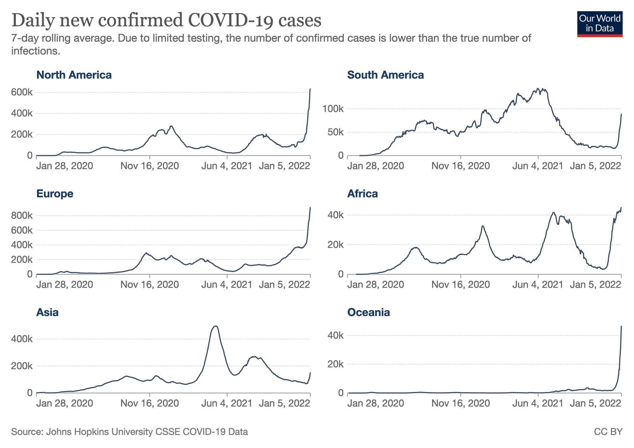 The world reported more than 9.5 million cases last week, which is a 71% increase compared to the previous week. Although the greatest increase is still in the Americas (+100%), every region in the world now has increasing case trends. (Notice the y-axis is different for each region in the figure below).