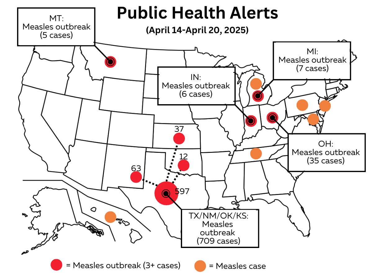 Measles cases are climbing exponentially. The U.S. has 839 cases and 7 active outbreaks, spanning states like Montana, Indiana, Michigan, Ohio, and Texas.
