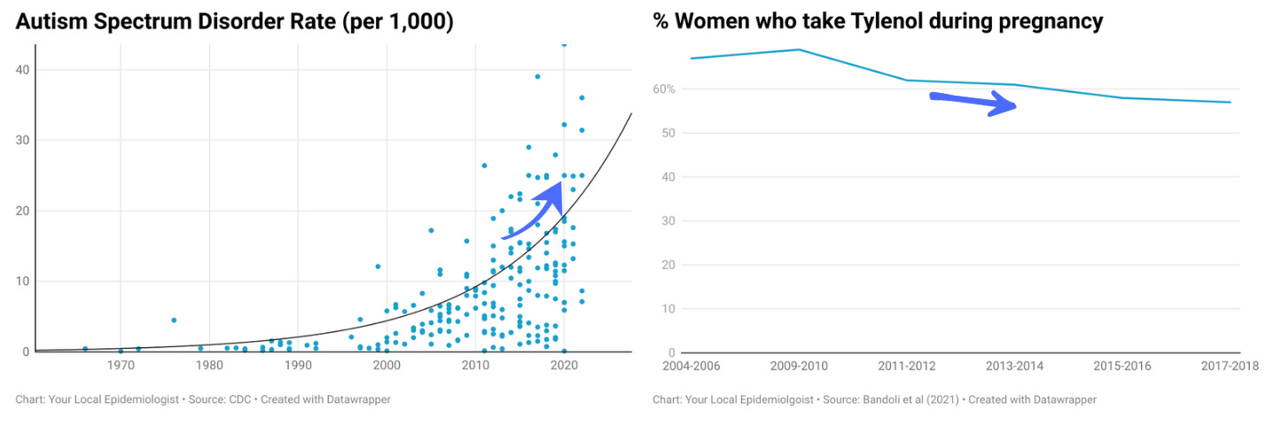 Tylenol use has decreased over time. So, again, another sign this isn’t leading to a dramatic rise in autism.