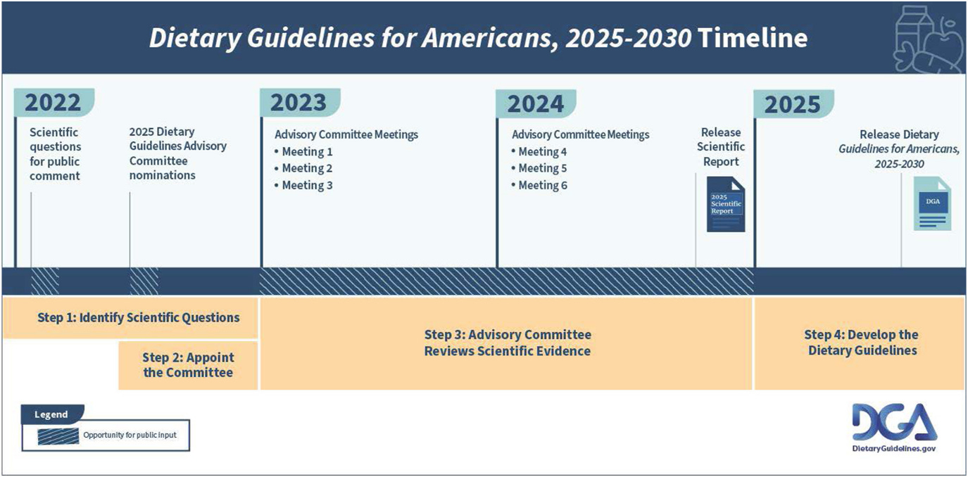 This framework is designed to promote scientific rigor, transparency, and public trust. The timeline below shows the planned process for the 2025-2030 DGA.