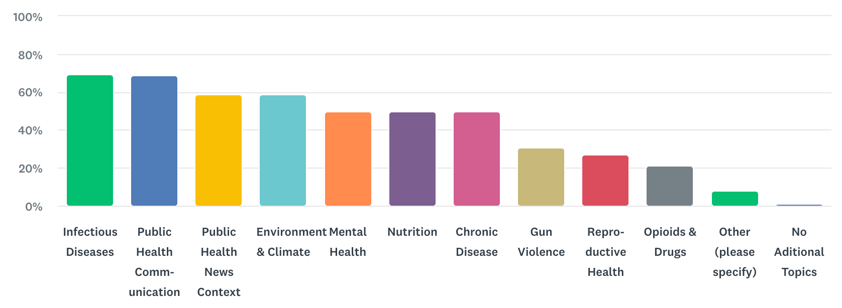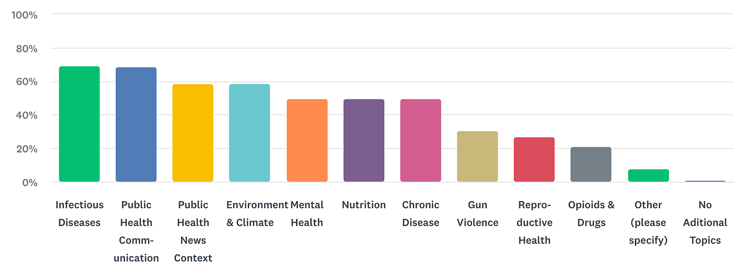 Infectious disease continued to be the main thing you were interested in—but there was strong (and growing) interest in public health communication and misinformation (69%). You also said you were interested in news analysis (59%), and climate and environment-related (59%) health topics. We tried to cover more of those topics.